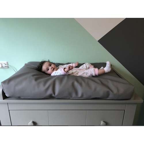Persoonlijk vind ik een aankleedkussen met een iets hardere ondergrond handiger. Kan je gemakkelijker een nieuwe pamper onder de billetjes schuiven en als er een ongelukje gebeurt, loopt het niet in een ‘deukje’ zoals te zien op de foto.
