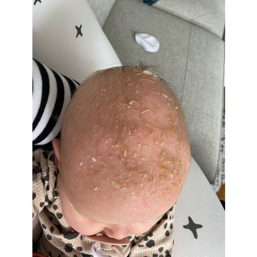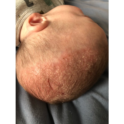 Babyolie smeren, uurtje in laten trekken en dan lekker in bad met badschuim schoonmaken. Niet teveel kammen of eraan rommelen. Zijn huidje is duidelijk geïrriteerd.