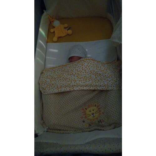 Ik heb als eerste laag een bovenlaken, dan een dekentje en dan het wiegdekentje met het leeuwtje. Dan vouw ik de bovenlaken om. Bij ons heel handig want nu hij zo goed op temp. blijft, moet er soms een laagje af. Ik ben m.u.v. van het bovenlakentje en het leeuw dekentje, dan ook bij dat ik met laagjes werk en niet dikke wiegdekens heb gekocht en werk met losse dekentjes.