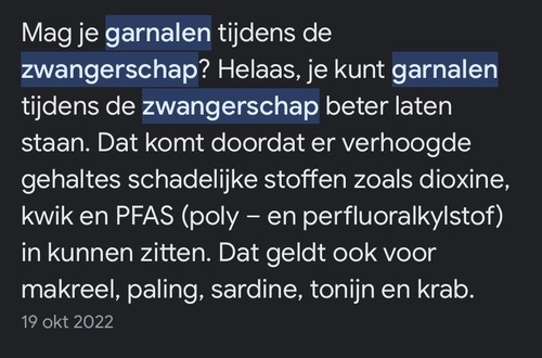 Ik heb ze mijn hele zwangerschap (nu ruim 33w) niet gegeten, totdat we zondag een borrelplank voor ons kregen op het terras met gefrituurde gamba's en mijn man dat absoluut niet lust. Toen heb ik het besluit genomen die 4 gamba's te eten, er intens van te genieten en daarna niet meer te eten 😁 In de zwangerhap app staat ook dat het schadelijk is bij grote hoeveelheden dus ik voelde me oké bij deze ene keer. Maar er is ook nog niet voldoende sluitend onderzoek zei mijn verloskundige. En (ook) daarom wordt het afgeraden.
