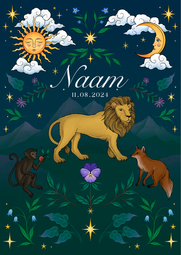 Ik vind het wel mooi! Ik hou ook van kleurrijk en uitgesproken, vind de meeste kaartjes wat tuttig en saai. Dat is dit niet! Kan misschien nog wat lichter, maar dit heeft ook wat. Mocht de leeuw naar het sterrenbeeld verwijzen, houd er dan rekening mee dat dat anders kan worden. Back up is dan wel handig. Hadden wij ook, kind werd 2 weken later dan de uitgerekende datum geboren en toen hebben we in de laatste dagen nog een element verwisseld.