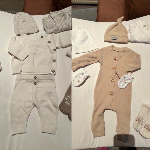 Ik heb deze. Links is van c&a in 50 en rechts Qiki label is 50/56 maar valt meer als 50. Allebei met rompertjes van h&m in maat 50.