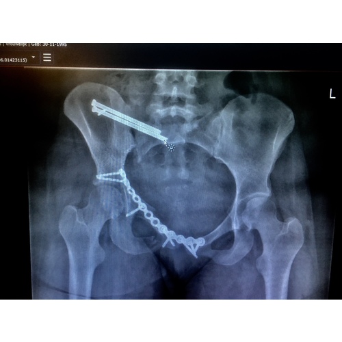 (Op de foto zie je hoe mijn bekken er aan toe was na het uitbreken van het osteosynthesemateriaal. Gebeurde spontaan, kans hierop is ongeveer 10%. Kort erna werd ik weer geopereerd om alles weer op zijn plek te zetten. Dit was geen makkelijke klus zeiden ze. Maar alles is goed gekomen en ik ben nu zelfs zwanger! :))