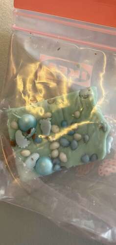 Ik had zelf witte chocoladefudge gemaakt, wat babyblauee kleurstof erbij en dan muisjes en sprinkles er doorheen. Slechte foto maar dit dus.