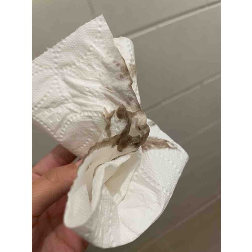 Ik snap dat je schrikt, misschien oud bloed waardoor het er donker uit ziet ...