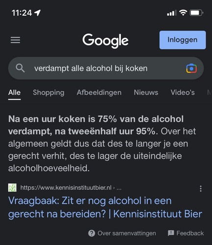 Wat overigens hieronder ook gedeeld wordt is dat eventuele alcohol eruit zou koken, dat is niet helemaal waar. Als je er gewoon wijn in zou doen zou de hoeveelheid alcohol wel verminderen maar niet wegkoken. Dus in sausjes/stoof etc geen echte alcohol (wijn/bier/sterke drank) toevoegen is het beste.