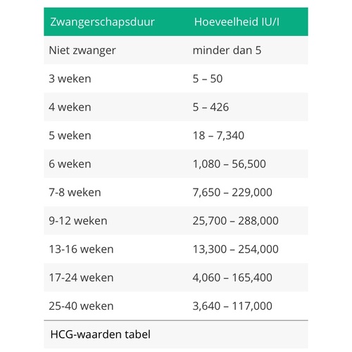 Misschien helpt deze tabel. Ook hier te vinden. https://www.24baby.nl/zwanger/zwangerschap-zo-werkt-het/het-zwangerschapshormoon-hcg/