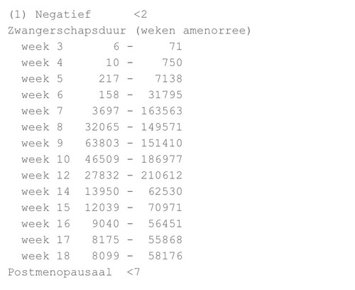Hier zie je de (heel grote) variatie waartussen waardes van HCG kunnen zitt ...