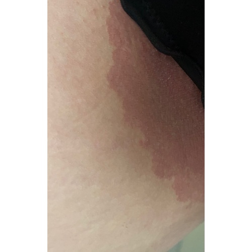 Hoi je zou een anti schimmelcreme kunnen proberen. Door de warmte/zweten/zwemmen kan het zijn dat je een schimmelinfectie hebt opgelopen. Probeer het droog te houden door eventueel iets van gaasjes erop te doen. Kan ook tijdens zwangerschap/borstvoeding volgens voorschrift gebruikt worden. Ik weet niet hoe lang je anders nog moet wachten tot je je eigen dokter weer kunt zien? Anders bij twijfel ziek worden ervan, ontstekingsverschijnselen, koorts een andere arts daar in de buurt bezoeken? Sterkte!