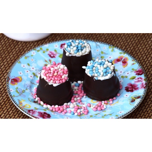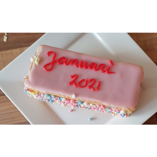 En je kan dus hierop wat muisjes strooien roze en blauw en dan in de koelkast..
