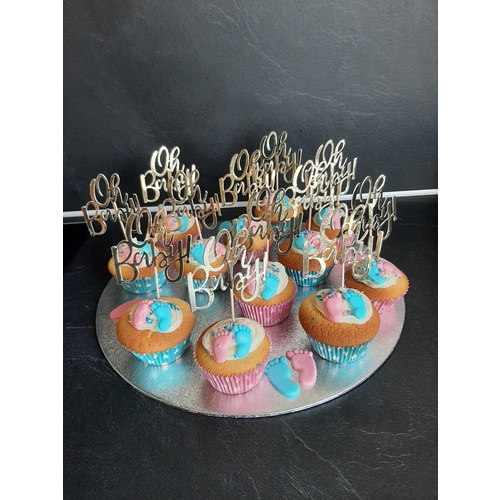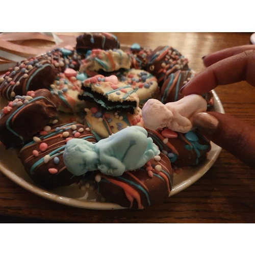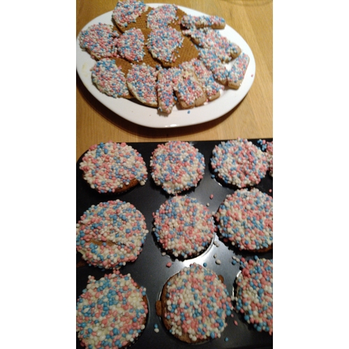 Ik had cakejes gebakken en die versierd met glazuur (boter kan ook) en roze en blauwe muisjes door elkaar.