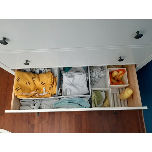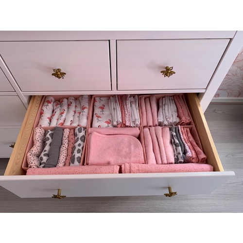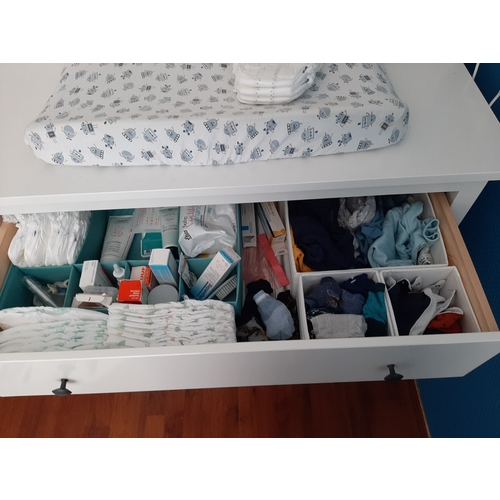 Onderste la zit voorraad pakken luiers en billendoekjes. Lade ernaast hydrofiele doeken, hoeslakens, verschoonkussenhoezen ect. Ik heb nog een andere kast staan met verdere spulletjes als voorraad lotions washandjes/handdoeken noem maar op. Succes wie weet heb je er wat aan😇