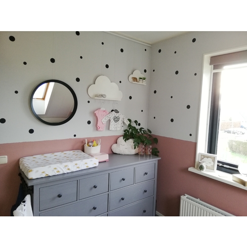 Op de commode ligt vanzelfsprekend een aankleedkussen en nog 1 mandje met luiers/billendoekjes en het andere mandje zit vooral verzorgingsproducten, zoals bodylotion, billenzalf, sudocreme, thermometer etc.