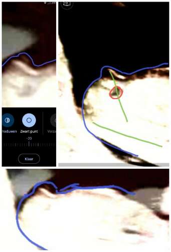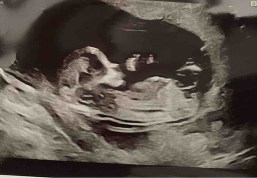 Zoals op de echo met de andere kleuren lijnen is er meer schaduw bij gedaan waardoor je ook duidelijker ziet dat de nub omhoog staat. De blaas zit ook erg laag en van nub naar blaas naar ruggengraad staat het in een hoek naar de ruggengraad(📐) dit duidt op een jongen. Bij meisjes loopt het gelijk of bijna gelijk aan de ruggengraad(=) de blaas zit daar dichter tegen de nub aan en is de nub plat en is er geen bolletje.