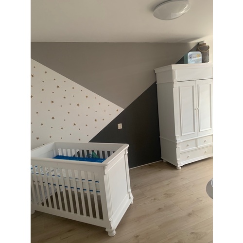 Ik weet niet precies de afmetingen maar hier een kleine kamer, met nog schuine muren ook. Naast de deur past er precies een kast (driedeurs), er hangt een wiegje en kan precies een commode tegenover. M’n vader heeft onder het dakkapel een kastje op maat gemaakt om spullen weg te stoppen. Ik heb geen foto van het geheel want het is heel onhandig deze indeling 😅