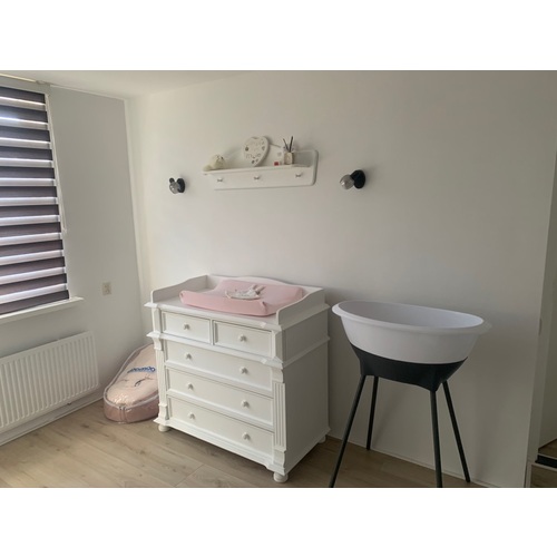 Kleding van de oudste ligt in de commode en voor de nieuwe baby hebben we een ladekast met aankleedkussen op onze kamer. Naderhand wordt er op de gang een gezamenlijke kledingkast geplaatst.