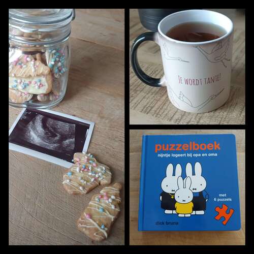 Mijn schoonouders hebben we het verteld met een pot met koekjes met muisjes, mijn ouders een puzzelboek 'Nijntje logeert bij opa en oma' en mijn zusje hebben we verrasst met een magicmok. Toen ze heet water in de mok deed, verscheen er langzaam 'je wordt tante'. Voor verdere familieleden gaan we een foto maken om het aan te kondigen