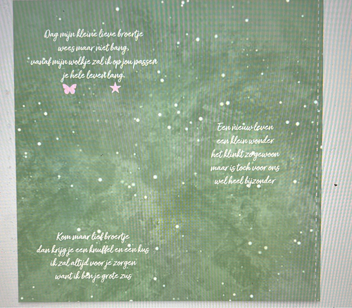 Wij hadden dit op het kaartje. Stukje tekst van zusje 💫, grote zus en van ons. Maar bij het stukje met onze info hebben we alleen gezet trotse ouders en grote zus. 😊