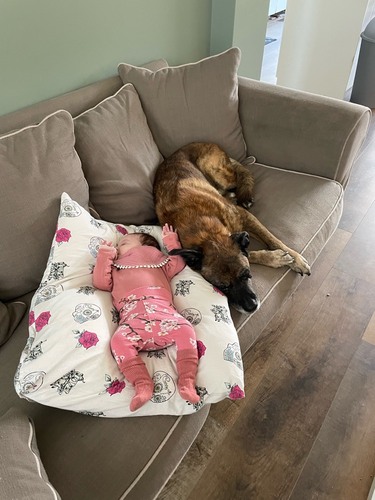 Onze dochter heeft de eerste weken heel veel krampen gehad, ik heb nachten met een krijsend kind door ons appartement gelopen en de hond was de enige die sliep. Soms kwam hij zelfs naast ons op de bank liggen als ik daar met haar in slaap was gevallen. Onze dochter heeft inmiddels het ramdom gillen ontdekt en dit doet hem niks. Ik maak mijzelf persoonlijk niet zo veel zorgen om het gillen, springen en rennen wat ze gaat doen omdat dit toch in stappen gebeurt en we onze hond goed kunnen begeleiden bij de stappen!