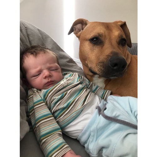 Ja hier een jaloerse am Stafford die ook bij mij slaapt. Maar met me zoontje nu van zeven weken gaat het super goed ze vind hem heel lief. Ze is alleen wel soms een beetje boos op mij haha. Maar ik heb haar me zoon helemaal laten aflikken en snuffelen met de ontmoeting.