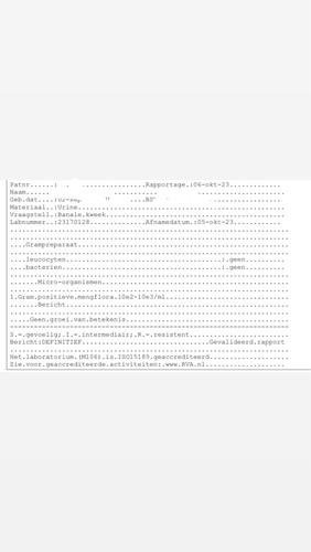 Daarnaast hebben ze een grampreparaat gemaakt van je urine, hierbij kleuren ze een druppel urine en bekijken ze onder de microscoop. Hier zitten geen bacteriën of witte bloedcellen (leucocyten) in.