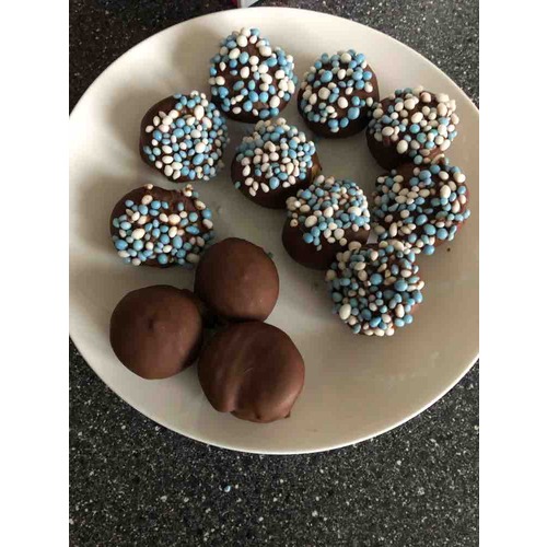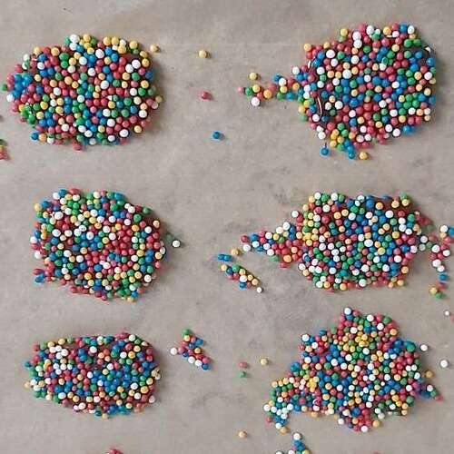 Hier blokjes chocolade iets gesmolten in de oven, bestrooid met gekleurde muisjes (landgenootjes) en platter geduwd met de bolle kant van een lepel. Af laten koelen in de koelkast en klaar 😊