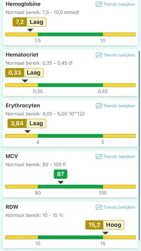 Ik moet van de verloskundige aan de ijzer tabletten. Ze heeft mij alleen niet uitgelegd hoe laag het is etc. Kan iemand mijn resultaten “translaten” en wat is een “goede” uitslag voor een zwangere vrouw. Alvast bedankt