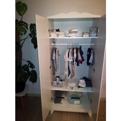Wij hebben een pax kast met van boven naar onder een plank, een roede en 3 lades waarvan 1 een mand is ivm de deuren. Verder hebben de nog de Hemnes als commode. Wij hadden deze kast ook nog en vindt het voor de toekomst fijn dat het een grote kast is. Verder hebben wij als bedje de bopita indy 😊😬