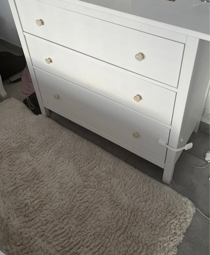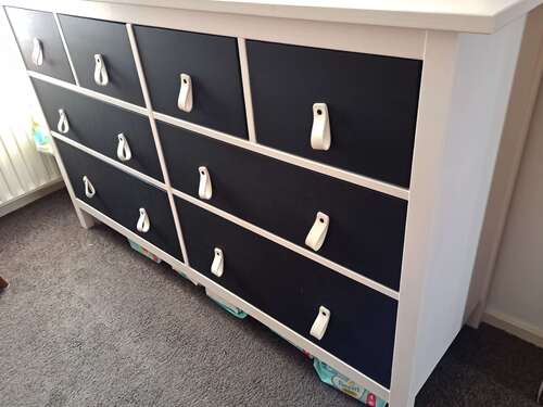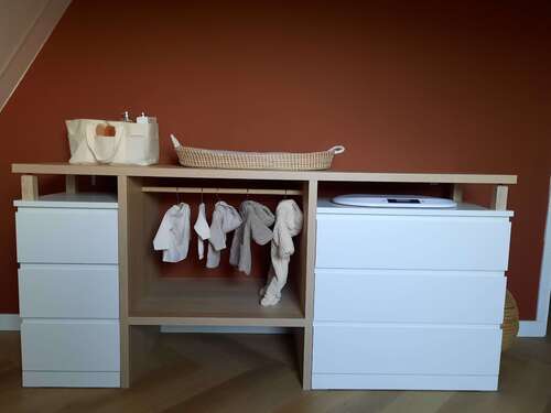 Ik heb dezelfde, met een extra verschoonblad erop gemonteerd zodat ik m'n dochter met de bibs naar mij toe kan verschonen. Leren lusjes als knopjes, bakje met luiers, waterwipes op het blad zelf. Eerste lade exta waterwipes, zalfjes, sokjes. Tweede lade en derde lade zijn 'verzamellades' met overbodige knuffels, paracetamol zetpillen, haarstrikjes en alle andere zaken waar ik even geen betere plek voor had 😅