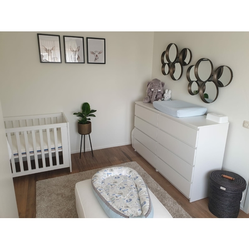 Hier de malm met 4 lades als commode. Nu nog niet in gebruik, aangezien ik nog moet bevallen! Ik heb lang getwijfeld of ik deze wilde, de hoogte hiervan is goed maar het aankleedkussen neemt wel het gehele oppervlak in beslag. Ik kan er dus geen spulletjes naast zetten en het moet ook niet gaan schuiven! Maar omdat we deze kast al hadden en hij overbodig is geworden ivm nieuwe kledingkasten, heb ik uiteindelijk besloten om eerst te kijken hoe het bevalt. Een ritje naar de winkel voor een nieuwe commode is zo gemaakt! De lades heb ik trouwens zelf beplakt.
