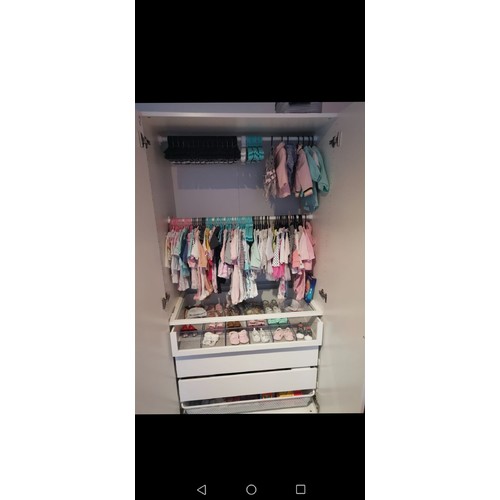 Ik heb dus 2 hang gedeeltes, daaronder een glasplaat en plank (met vakverdelers) met schoentjes en had daar eerst ook mutsjes, lade 1 met bakjes waar leggings, broekjes, haarbandjes, maillots, zwempak jes, lade 2 voorraad grotere kleding in bakken gelabeld met de naast erop en laatste draadjesmand extra schoenen, voorraad billendoekjes en extra luiers, speelgoed waar ze nog te klein voor is