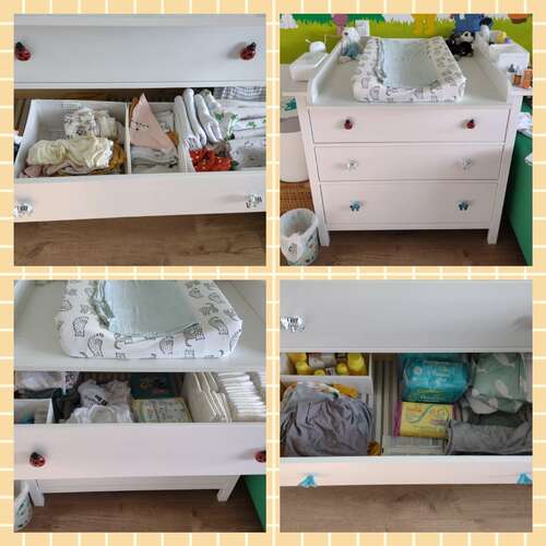 Wij hebben één Ivar kast van 50 cm breed precies op voor ons ideale werkhoogte gemaakt. Daar hebben we Onsklig bakjes aan de zijkant hangen. Tot nog toe geeft dat voldoende ruimte voor alle babykleertjes, verzorgingspulletjes en beddengoed. Alleen het badje en de luieremmer passen er niet in. Wij wonen klein, dus een extra kast willen we ook eigenlijk niet tot we volgend jaar verhuisd zijn.