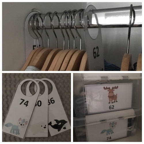 Ik heb in de kledingkast alles van de huidige maat en volgende maat trouwens. Hier heb ik hangers tussen die aangeven wat bij welke maat hoort. De kleding die te klein of groot is heb ik in plastic bakken van de Hema die precies in de kast passen.