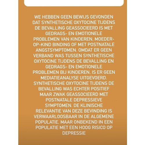 Er zijn geen wetenschappelijk onderbouwde artikelen te vinden die aangeven dat synthetische oxycotine niet veilig is of dat er een verband is met postnatale depressies. De enige artikelen die er wél te vinden zijn, zijn op vage websites die geen bronnen weergeven. Laat je niet bang maken. Er worden zoveel vrouwen ingeleid, als die allemaal een postnatale depressie kregen dan waren er in Nederland klinieken vol met vrouwen.