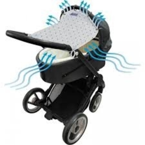 De dooky die ik zag knoop je vast aan de stang. Er hangt dus niks los voor wat de toevoer van frisse lucht blokkeert waardoor de temperatuur op kan lopen. De dooky die ik heb gezien span je ervoor en er kan een de zijkanten gewoon frisse lucht in. Maar de joolz geo heeft ook al een extra zonneklep die je uit kan klappen, wellicht is dat al voldoende.
