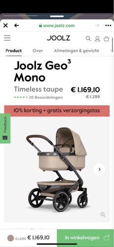 Ben nu zwanger van mijn tweede kindje, we hebben nog een mutsy transit in de schuur staan maar ik wilde toch een Joolz geo vanwege de grote boodschappen mand. We hebben de geo 1 tweedehands voor maar 100 euro op de kop kunnen tikken. Hij is helemaal in orde, alleen moesten er nieuwe banden onder, vandaar de lage prijs. Gelukkig kan je veel onderdelen gewoon apart bestellen, dus zijn we nu super goedkoop uit en hebben we een goede kinderwagen. Ook al wilde ik echt een Joolz, de prijs van een nieuwe vond ik echt te hoog voor die tijd dat je hem gebruikt.