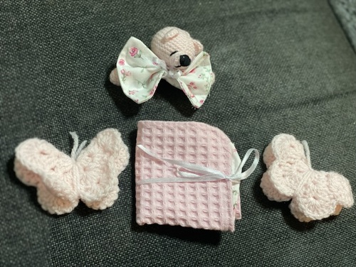 Voor mijn dochtertje heb ik een mooi omslag doekje gekocht met een knuffeltje en 2 vlinders erbij. 1 vlinder heb ik bij haar gezet en de ander voor mezelf gehouden en geplaatst onder mijn kussentje.