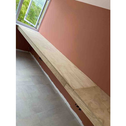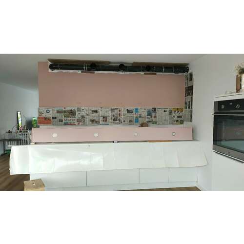 Ik vind het een mooie kleur. Een beetje tussen roze en Terra in. Erboven hebben we bleek roze (ook karwei).