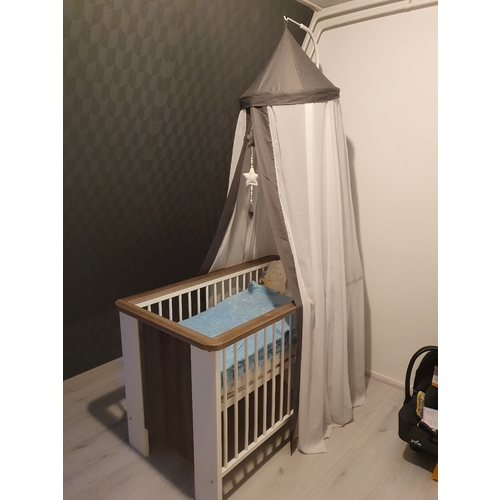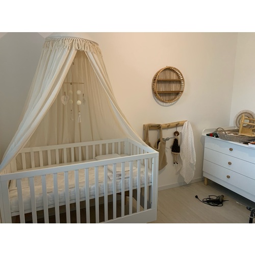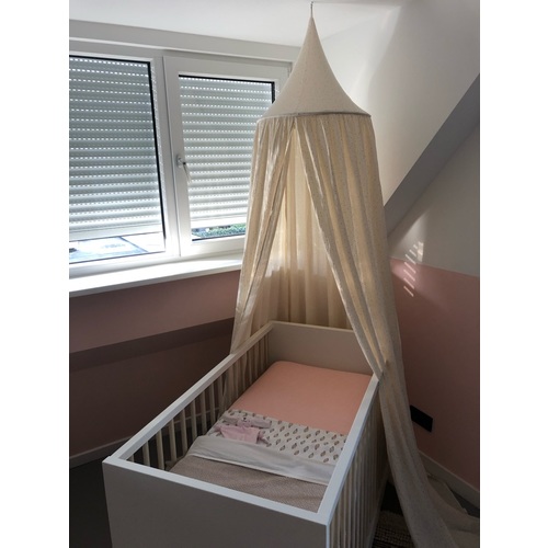 Wit met hout ledikant, hemel is wit met gouden stipjes. Ik had er meerdere besteld en door mn vriend omhoog laten houden, en toen eentje uitgekozen. Kwam er online niet helemaal uit! Misschien ook wat voor jou?