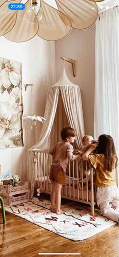 Mee eens, en zo’n haak kan je bij elke bouwmarkt halen. Is een plankendrager. Maar zou een klamboe niet doen, tis mooi maar niet veilig en om dit nou voor die eerste paar maandjes allemaal te doen.. Wellicht wel leuk om zo’n plankendrager te gebruiken met een mooie mobiel die hoog genoeg hangt?