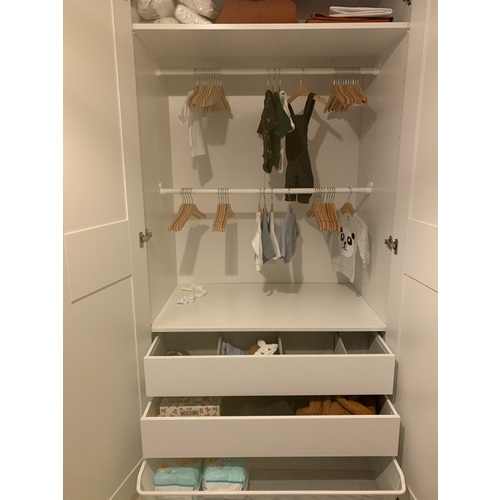 De kast kan ik je niet mee helpen. Maar de babykamer misschien wel, de modular 2 van babypark is niet precies hoogglans, maar ook niet helemaal mat en ze hebben ook een driedeurskast. Je kunt deze serie grotendeels zelf samenstellen met verschillende poten en opties. Zelf zijn we erg tevreden hierover en gaan we binnenkort ook het grote bed en de rest van de serie erbij halen.