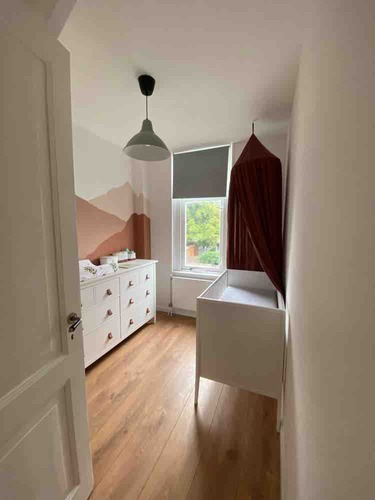 Hier ook een kleine baby (inmiddels peuter) kamer. De grote Ikea Hemnes commode is ideaal. Verder een ledikantje en een kleine fauteuil, meer is er niet nodig.