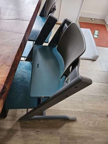 Twee zwarte tripp trapps. We hebben een donkerhouten tafel met zwarte poten en stoelen in dezelfde kleuren.