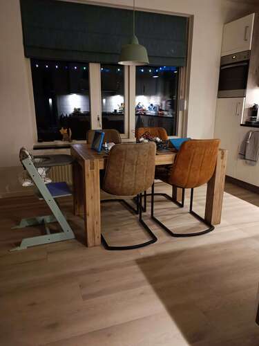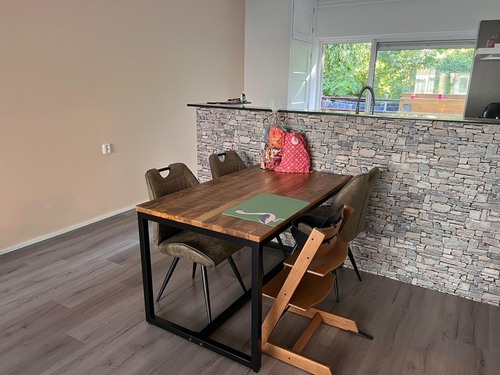 Foto van toen we net terug in Nederland waren. Wij hebben de kleur bruin eiken uit de Oak lijn met een zwarte inzet. Heel blij mee, past heel goed bij onze mango houten meubels!