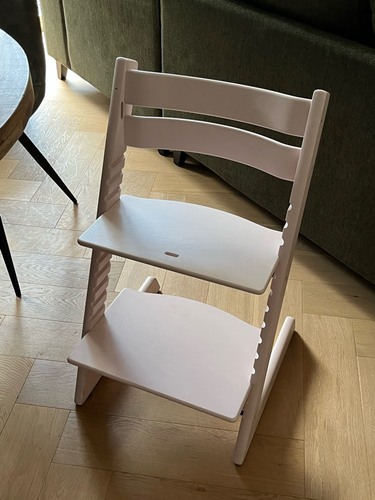 Wij hebben een grijze tripp trapp. Daarbij een tafel met walnootbruin hout en witte poten en antraciet kleurige stoelen met witte poten. Combi staat prima 😊