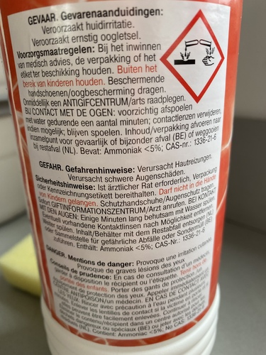 MarijkeYoshi je hebt gelijk het is ammonia! Er zit < 5% in dat is inderdaad een geruststelling en eerlijk ik heb er echt 0.0 iets van geroken daarna uur in de tuin gezeten totdat het veilig was om in die ruimte weer broodjes te smeren en echt je ruikt niks! Stresskip die ik ben 😣