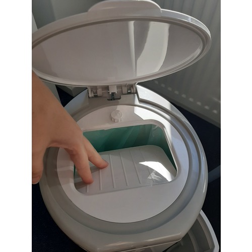 Er zit zelfs een slot op dat het klepje waar de luier doorheen gaat niet open kan gaan staan