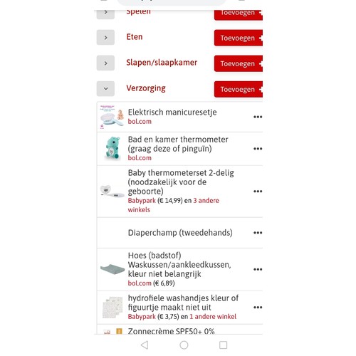 Hier kunnen we opzetten wat we nodig hebben, waar je het kunt kopen met eventueel een linkje naar een webshop, hoeveel het ongeveer kost en ze kunnen het afstrepen als het gekocht is. Ook kun je items zoals luiers, shampoo, doekjes etc "vastzetten", dan kunnen ze niet af gestreept worden en kunnen meerdere mensen dit aanschaffen.