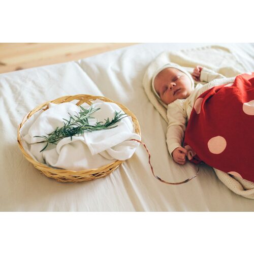 Ik had een wollen slaapzak van Joha met een open onderkant die je dicht kon trekken met een touwtje, een aanrader! Hier kon de navelstreng goed uit namelijk.