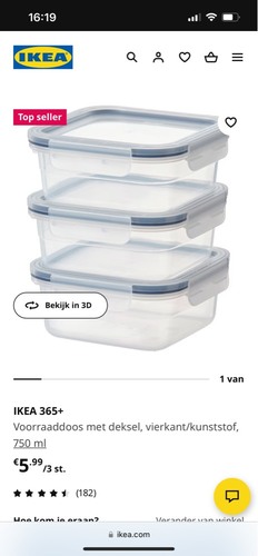 Ik zag dat ze bij de aldi volgende week bakjes in de aanbieding hebben. Curver geloof ik. Zelf heb ik 2 weken geleden bakjes gehaald van het kruidvat (whatshome geloof ik), die zijn ook echt heel fijn. Die van de ikea vond ik niks, die clipjes van het deksel gaan zo snel kapot!